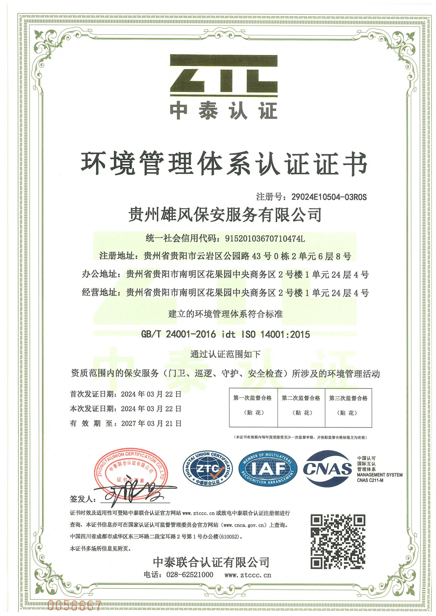 環(huán)境管理體系認(rèn)證證書